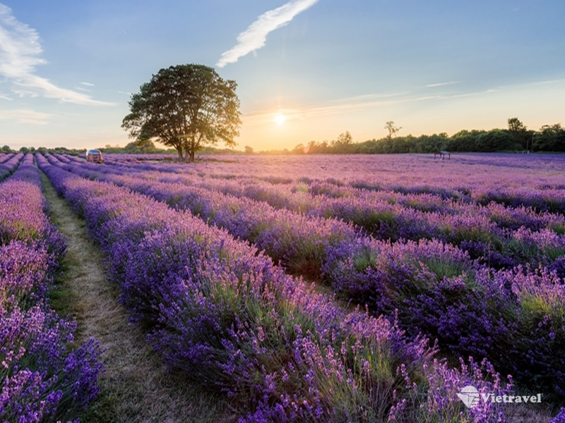 - Quý khách sẽ tận mắt ngắm nhìn những cánh đồng hoa oải hương (*) đang khoác lên mình chiếc áo màu tím biếc