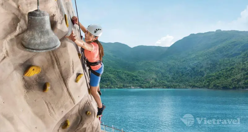 • Leo núi nhân tạo ngay trên du thuyền sẽ mang lại cảm giác hồi hộp và phấn khích cho bất cứ ai yêu thích mạo hiểm. Giày chuyên dụng, mũ bảo hiểm và dây an toàn sẽ được cung cấp để Quý khách chinh phục vách núi dựng đứng cao 12 mét và có một tầm nhìn bao quát ra đại dương trong xanh.