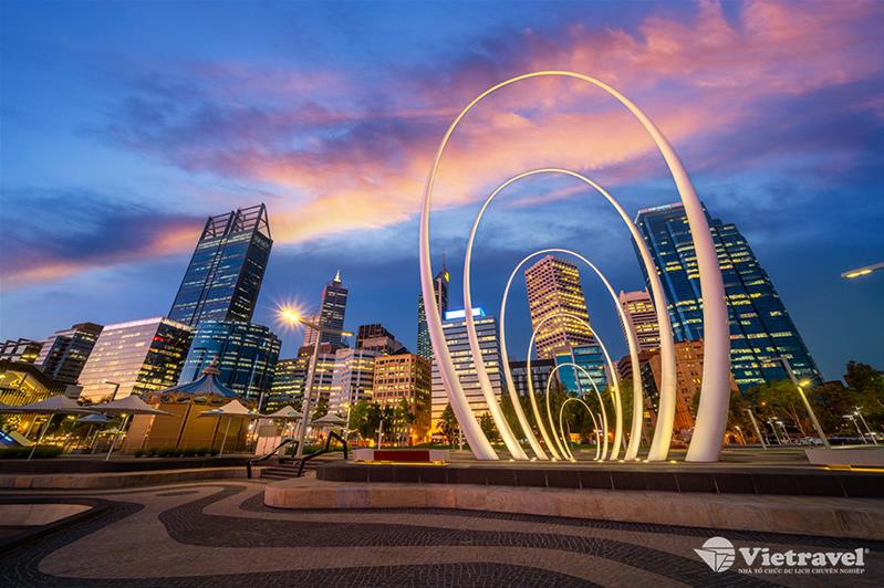 Trưởng đoàn Vietravel đón Quý khách tại cổng hẹn ở sân bay Tân Sân Nhất, làm thủ tục đáp chuyến bay thẳng đến Perth cùng hãng hàng không Vietjet. Đến nơi, sau khi hoàn tất thủ tục nhập cảnh, xe đón đoàn về khách sạn nhận phòng nghỉ ngơi. Quý khách ăn tối tại nhà hàng địa phương và tự do khám phá thành Perth về đêm.