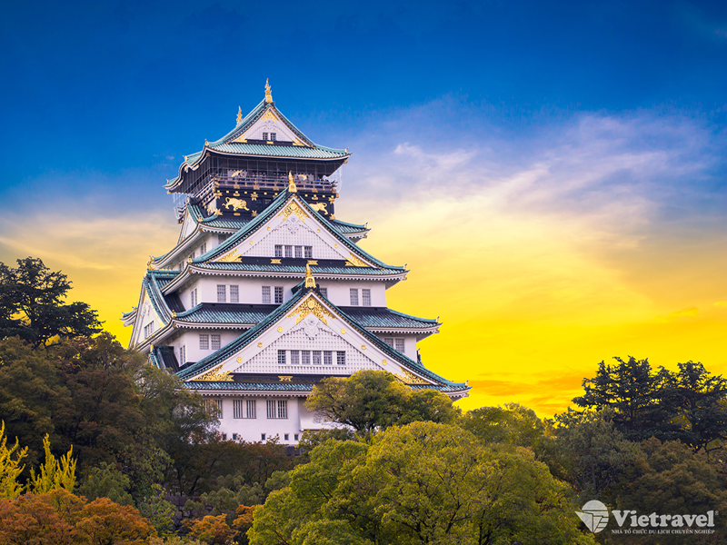 Đến sân bay, Trưởng đoàn Vietravel hỗ trợ làm thủ tục nhập cảnh. Quý khách bắt đầu hành trình tham quan chụp hình bên ngoài Lâu đài Osaka biểu tượng của thành phố Osaka, với các đường hào uốn lượn bao quanh tuyệt đẹp, các công trình kiến trúc độc đáo mà mỗi tòa nhà là một bảo tàng về nghệ thuật kiến trúc cổ, là niềm tự hào của người Osaka cũng như người Nhật Bản. (Tham quan chụp ảnh bên ngoài lâu đài).