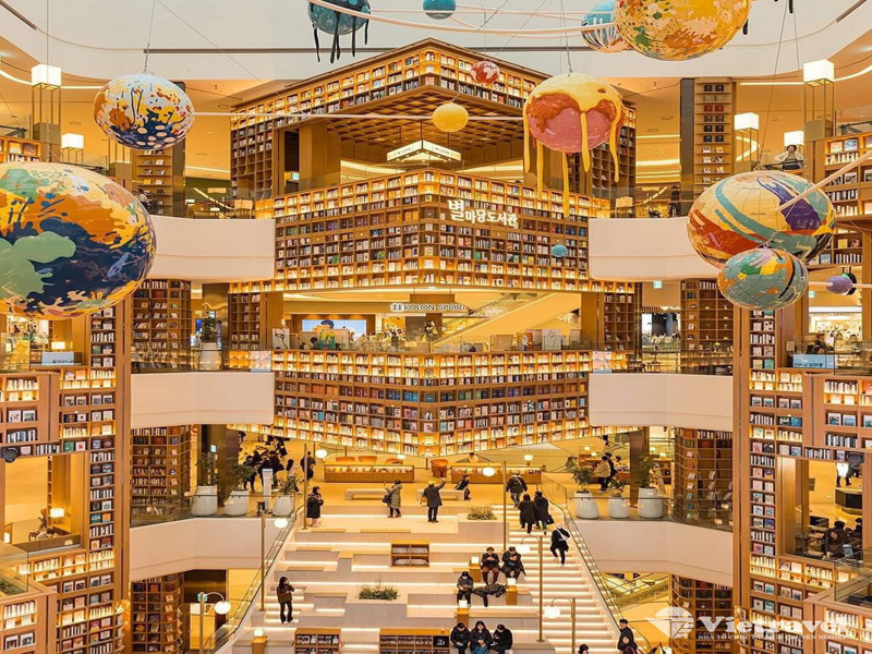- Thư viện Suwon Starfield - là một trong những thư viện mới và lớn nhất ở Hàn Quốc, được khai trương vào đầu năm 2024 với bộ sưu tập hơn 1 triệu cuốn sách. Thư viện có kiến trúc độc đáo, với mái vòm lớn cho phép ánh sáng tự nhiên vào bên trong. Nhờ kiến trúc độc đáo mới lạ và không gian đọc rộng lớn nên nơi đây đã trở thành một địa điểm nổi tiếng đối với cả người dân địa phương và du khách. Bước vào thư viện, bạn sẽ bị choáng ngợp bởi lối kiến trúc hiện đại và cách bài trí không gian cực hợp lý ở đây, hứa hẹn mang đến cho bạn nhiều trải nghiệm thú vị.